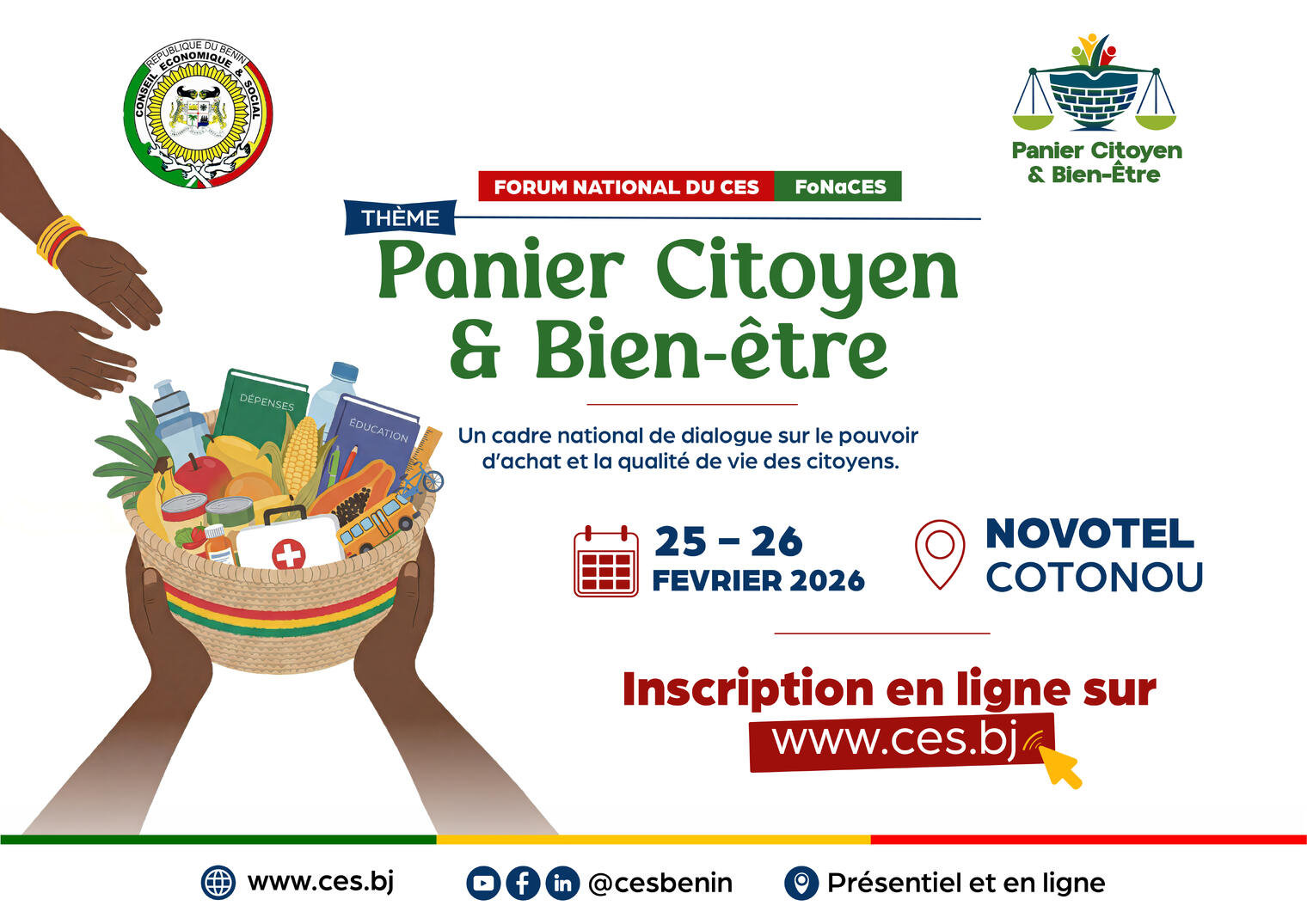 Le Forum National du Conseil Economique et Social, en abrégé FoNaCES, est un espace d’échanges périodiques initié par l’institution autour de thématiques majeures d’intérêt national. Il vise à réunir, à chaque édition, les conseillers et différentes couches socio-professionnelles du pays dans un cadre de dialogues, de concertations et de réflexions, en vue de formuler des recommandations pertinentes à l’endroit des pouvoirs publics. Pour sa première édition en 2026, le FoNaCES se tient sous le thème « Panier citoyen et Bien-être ». Ce grand rendez-vous se tiendra les 25 et 26 février 2026 à Novotel Orisha Hôtel à Cotonou, avec la possibilité de participation en ligne sur inscription.